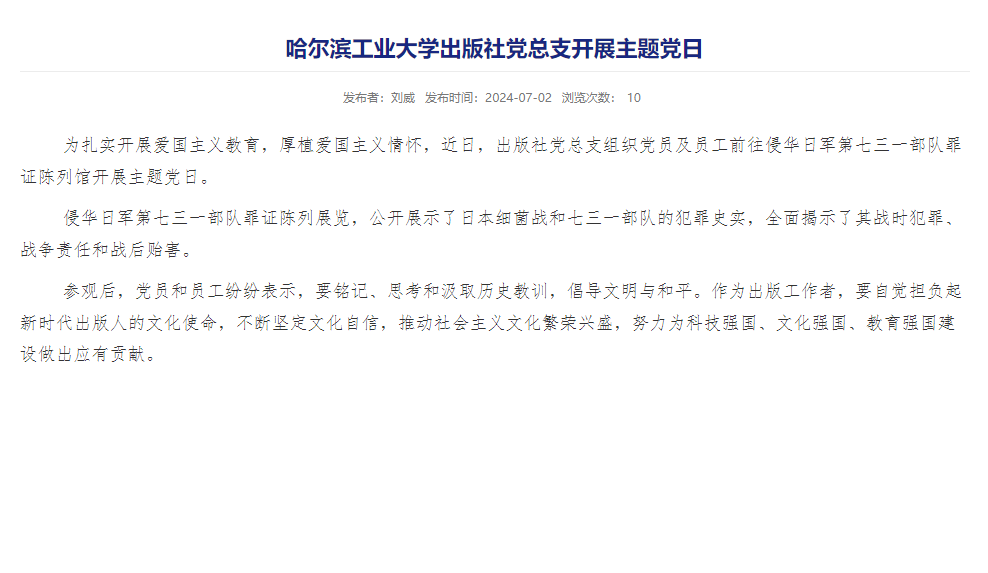 為扎實開展愛國主義教育,厚植愛國主義情懷,近日,出版社黨總支組織黨員及員工前往侵華日軍第七三一部隊罪證陳列館開展主題黨日...